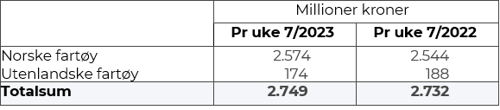 Tilsvarende for uke 7 i fjor var omsetninga 518 millioner kroner, av det var 47 millioner kroner etter landinger fra utenlandske båter. Omsetningen for norske båter på 471 millioner kroner var fordelt med 343 på fersk og 128 på fryst råstoff.