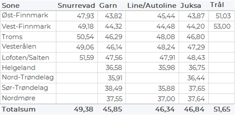 Omregnet til rundpriser, for NOR-fartøy, fersk, A og krokfanget kvalitet, hovedprodukter (uten kaisalg og etterbetaling).