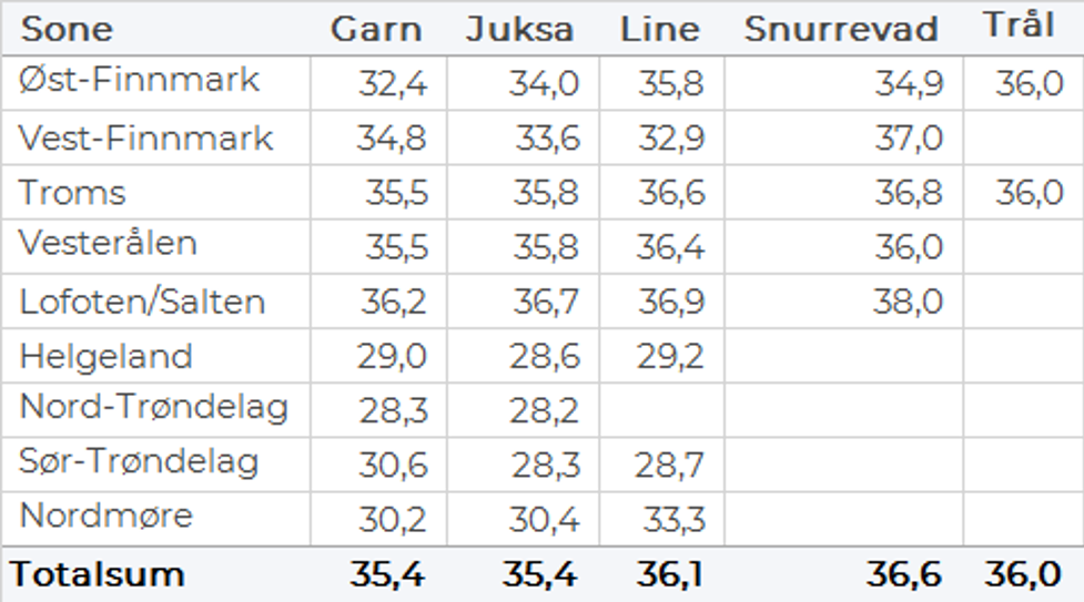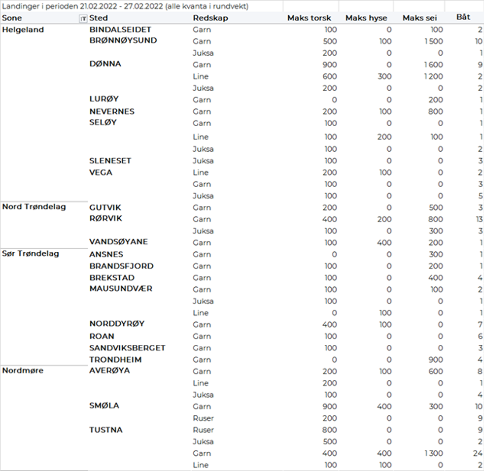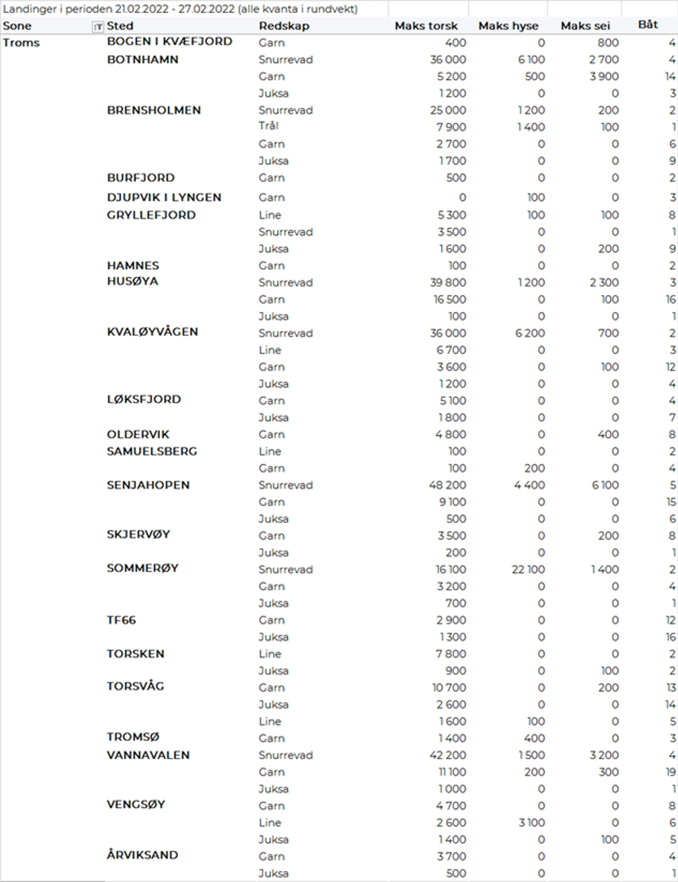 Tabell 3 viser andelen av dette kvantumet registrert med kvalitet A og Ekstra på sluttseddel, tatt på redskapene garn, juksa, line, snurrevad og trål, og tilhørende snittpriser pr leveringssone, sammenlignet med samme uke i fjor. Tabell 4 viser tilsvarende snittpriser oppnådd i uke 8 fordelt på de nevnte redskapene. Vest-Finnmark var størst i kvantum med 2.800 tonn og økte med det fra 1.730 tonn uka før. Øst-Finnmark hadde også økte torskelandinger, opp fra 790 tonn i uke 7 til 1.100 tonn i uke 8. Men for øvrig var det reduksjoner. I Vesterålen ble det landet 2.440 tonn i uke 8, i Troms 2.250 tonn, for begge var det en reduksjon på 1.100-1.200 tonn fra uka før. Kvantumet levert Lofoten var 1.670 tonn mot 1.810 tonn uka før. Labert med landinger lenger sør, i området Helgeland-Nordmøre ble det levert 40 tonn mot 50 tonn i uke 7.