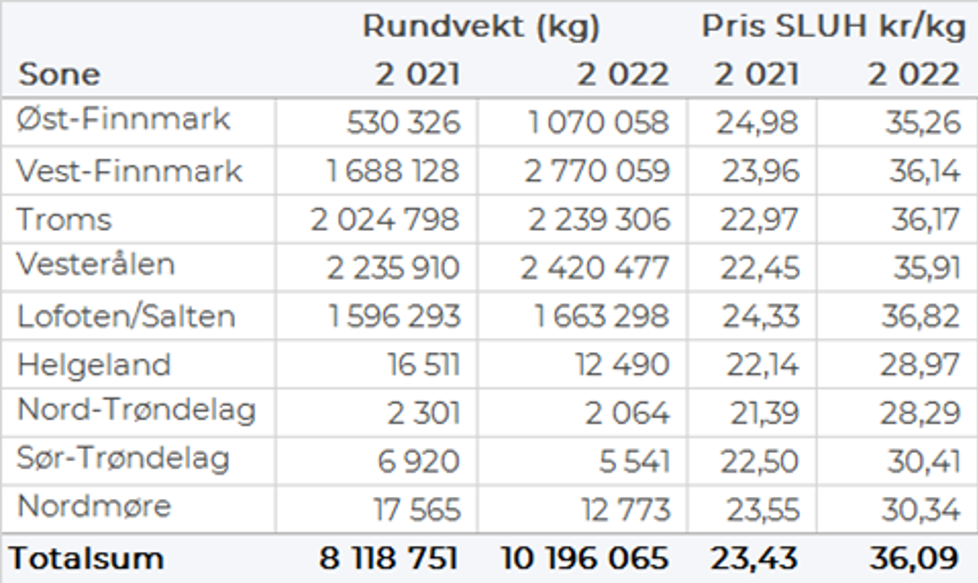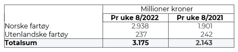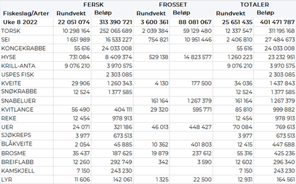 Totalomsetningen hittil i år sammenlignet med tilsvarende periode i fjor framgår av tabell 1. Den økte omsetningen for norske båter er på godt og vel 1 milliard kroner, fordelt med pluss på 644 på fersk- og 392 på frystomsetningen. Frystomsetningen er pr uke 8 i år på 1.149 millioner kroner, mens ferskomsetningen er oppe i 1.790 millioner kroner. En stor del av den økte frystomsetningen skriver seg fra sluttspurten i 2021 der kvantumet er omsatt på begynnelsen av 2022. Men økt omsetning av fryst råstoff også i uke 6, da ny ukerekord ble satt med 270 millioner kroner. Omsetningen av fryst torsk pr uke 8 i år er 751 millioner kroner mot 469 millioner kroner til samme tid i fjor, av kvantum på henholdsvis 26.800 og 23.340 tonn. Også fryst sei og hyse har ei fin øking både i kvantum og verdi. Når det gjelder omsetningen av fersklevert råstoff, drar torsken opp både pga. økte priser og økt kvantum. Kvantum fersk torsk omsatt så langt er 51.080 tonn, mot 45.180 tonn til samme tid i fjor, verdien er opp fra 799 til 1.265 millioner kroner. Omsatt kvantum fersk sei er litt opp til 13.400 tonn, og verdien er opp fra 91 til 131 millioner kroner. Kongekrabbekvantumet er opp fra 506 til 620 tonn, og som følge av økte priser er verdien økt med 138 %, fra 108 til 257 millioner kroner.