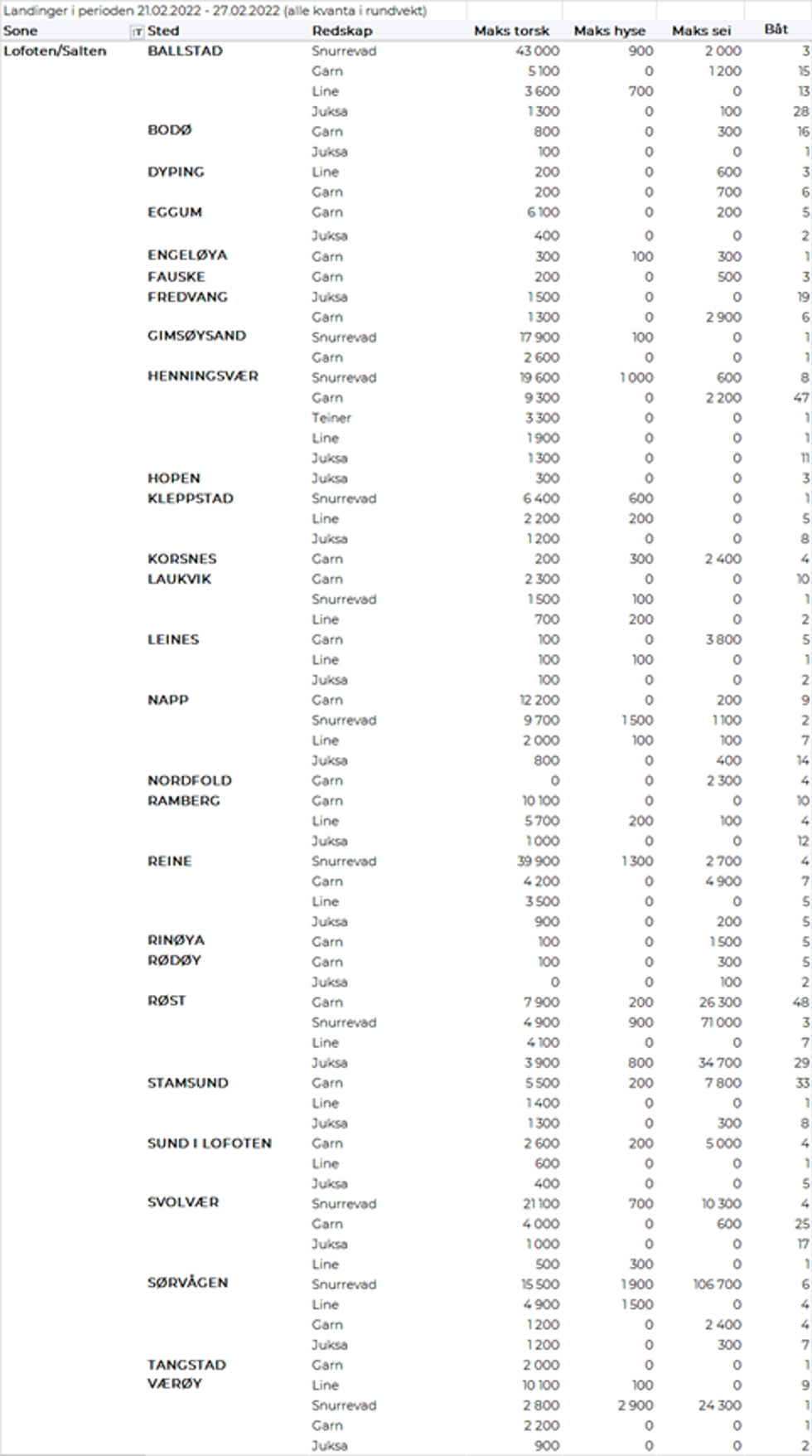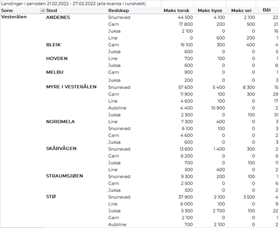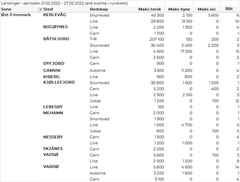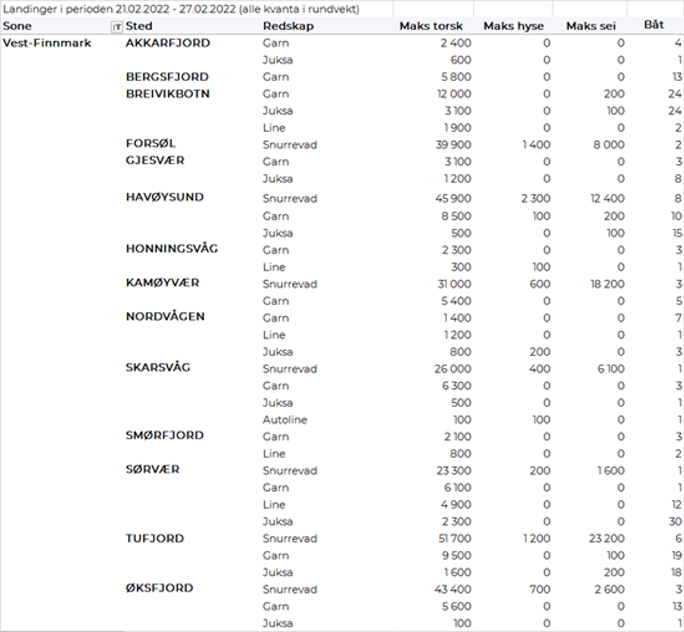 Snurrevad økte sine landinger fra 4.850 tonn i uke 7 til 5.320 tonn i uke 8, trål økte fra 300 til 370 tonn, men for øvrige redskaper var det reduksjon. Størst reduksjon på garn, ned fra 4.750 til 3.300 tonn, line/autoline fra 810 til 750 tonn og juksa fra 600 til 560 tonn.