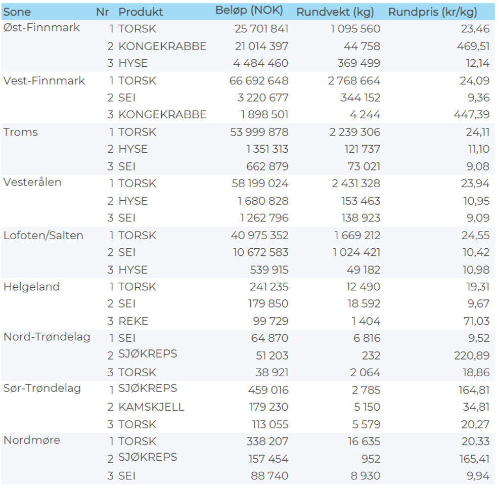 Omregnet til rundpriser, for NOR-fartøy, fersk, A og krokfanget kvalitet, hovedprodukter (uten kaisalg og etterbetaling)