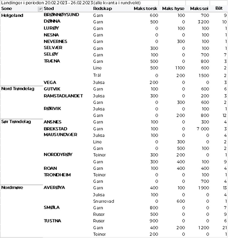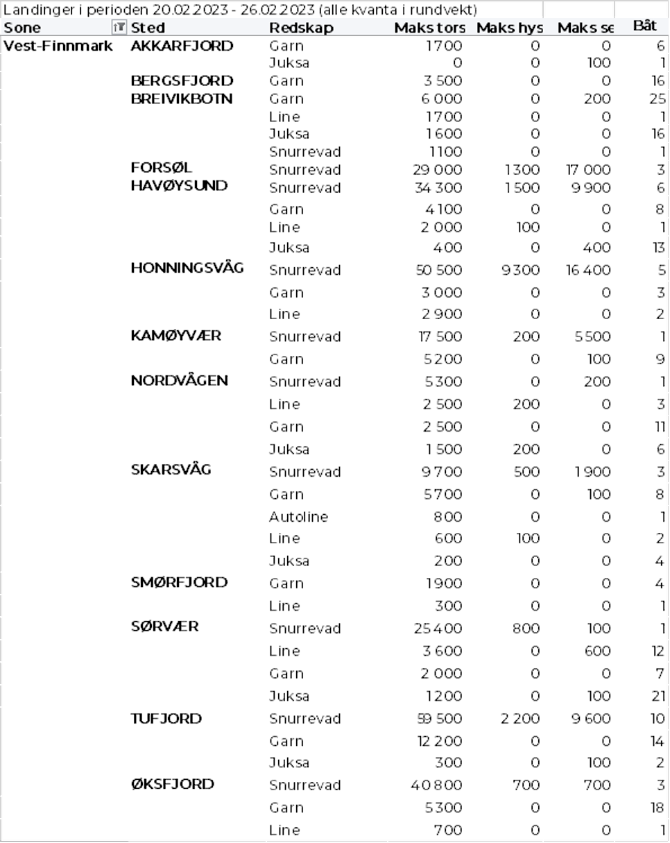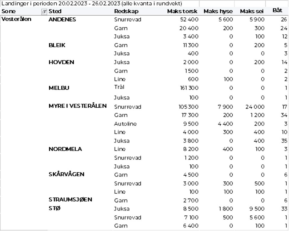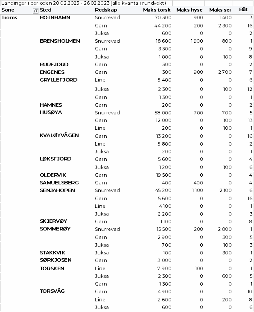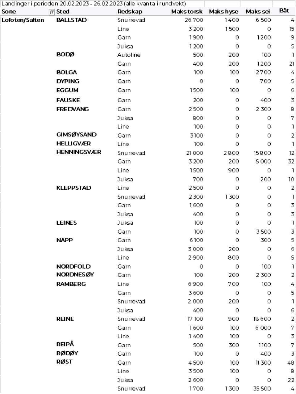 Omsetningen av fersk torsk i uke 8 utgjorde 9.675 tonn til en verdi av 310 millioner kroner. Dette er den nest høyeste ukesomsetningen så langt i 2023, bare slått av uke 7 da vi nådde 10.700 tonn og 348 millioner kroner. Fordelt per redskap viser tallene 5.110 tonn fra snurrevad, 2.900 tonn fra garn, 850 tonn fra line/autoline, 480 tonn fra juksa, og 330 tonn var tråltorsk. Største leveringssone er Vesterålen med 2.800 tonn. Deretter følger Vest-Finnmark med 2.200 tonn som er knepent foran Troms med 2.180 tonn. Deretter følger Øst-Finnmark med 1.410 tonn og Lofoten med 1.060 tonn. Kvanta under 15 tonn i resterende soner.