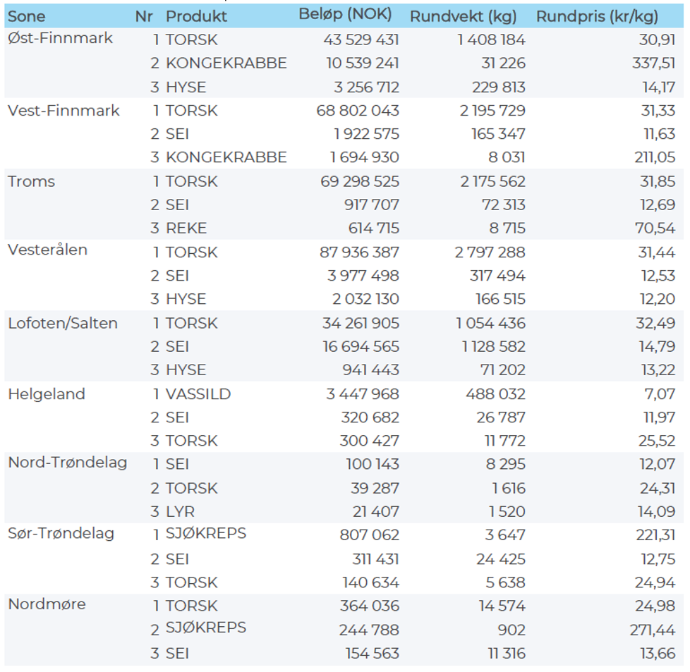 Omregnet til rundpriser, for NOR-fartøy, fersk, A og krokfanget kvalitet, hovedprodukter (uten kaisalg og etterbetaling).