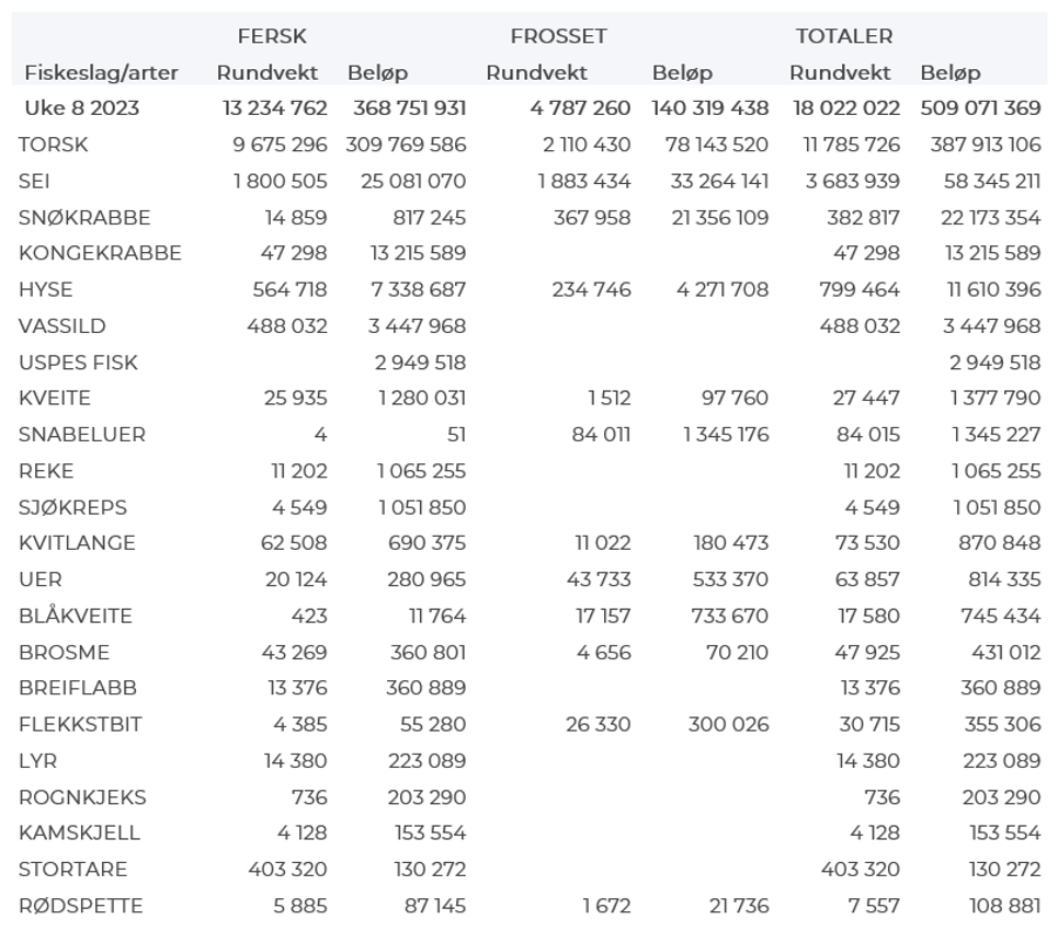 Omsetningen av ferskt råstoff i uke 8 ble 369 millioner kroner, som var ned fra 424 millioner kroner i uke 7. Torsk, sei og kongekrabbe var størst i verdi med henholdsvis 310, 25 og 13 millioner kroner, og for øvrig slik det framgår av tabell 2.
