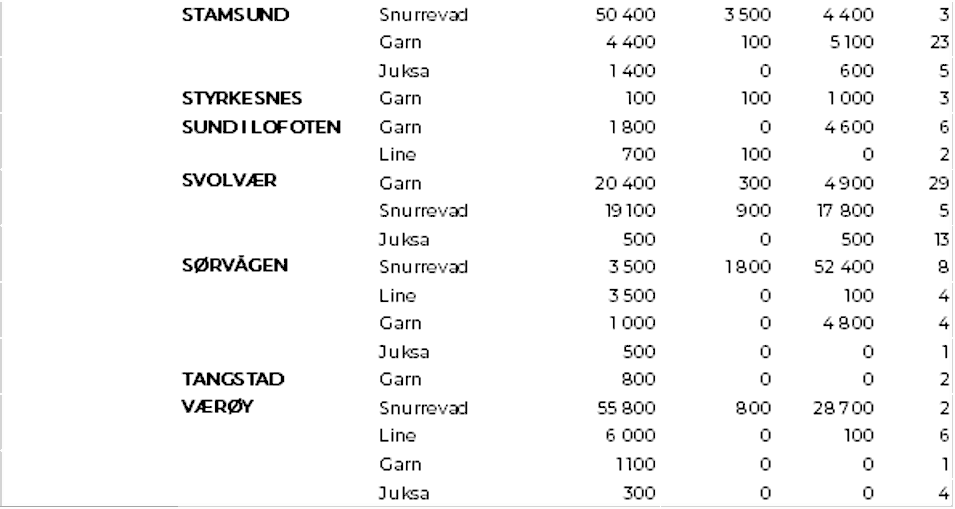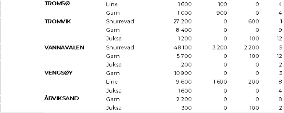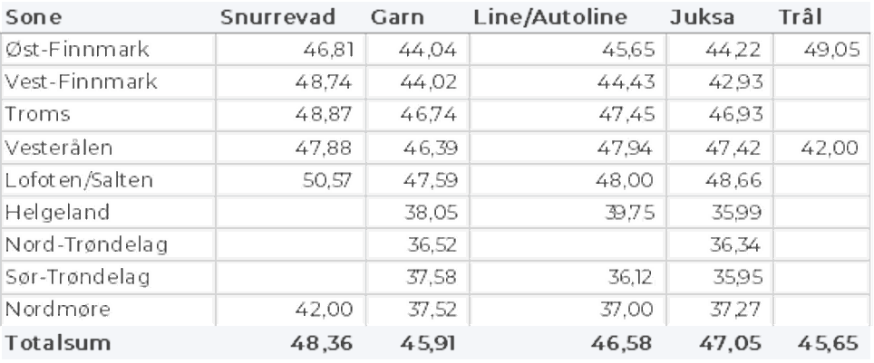 Totalomsetningen hittil i år sammenlignet med samme periode i fjor framgår av tabell 1. Det er liten forskjell årene imellom når det gjelder totalomsetning, men likevel er det store forskjeller når vi sorterer på fersk/fryst og pr fiskeslag. Av omsetningen for norske båter er andelen fersklevert råstoff ned med 86 millioner kroner, fra 1.795 millioner kroner i fjor til 1.709 millioner kroner i år. Fersk torsk gir seg størst utslag her. Så langt er 34.500 tonn fersk torsk levert til verdi 1.097 millioner kroner, mot 51.200 tonn og 1.270 millioner kroner til samme tid i fjor. Kvantumet er dermed 16.700 tonn lavere, og verdien ned 173 millioner kroner. Omsetningen av fersk sei trekker i motsatt retning, med 19.830 tonn/263 millioner kroner hittil i år, mot 13.520 tonn/132 millioner kroner i fjor. For fersk sei er kvantumet økt med 6.310 tonn og verdien er økt 131 millioner kroner, dvs. med 100 %.