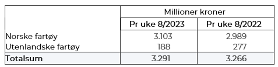 Tilsvarende for uke 8 i fjor var omsetninga 534 millioner kroner, av det var 89 millioner kroner etter landinger fra utenlandske båter. Omsetningen for norske båter på 445 millioner kroner var fordelt med 314 på fersk og 130 på fryst råstoff.