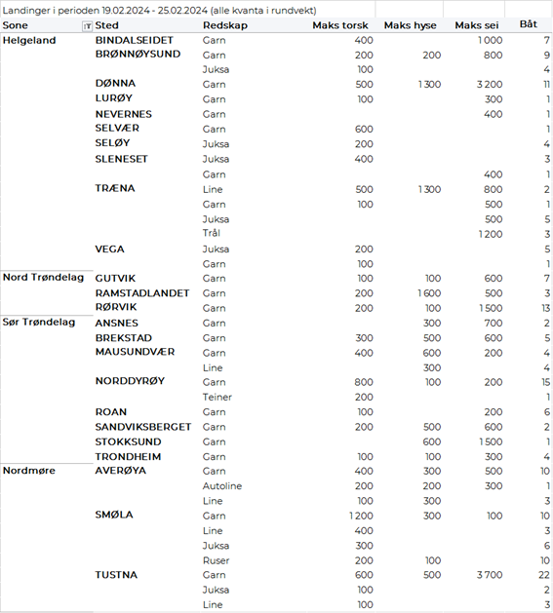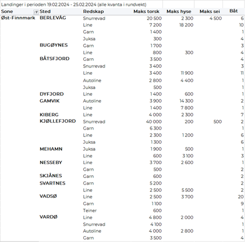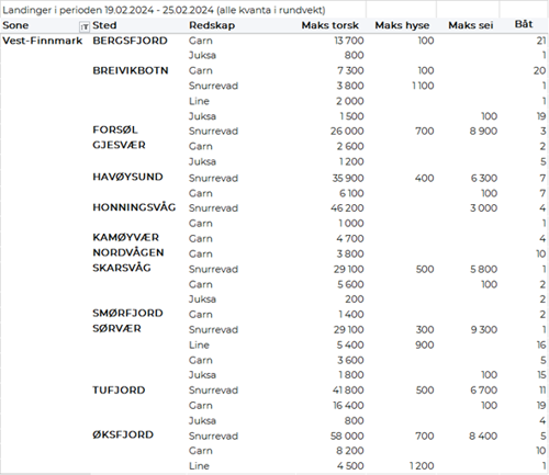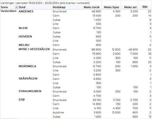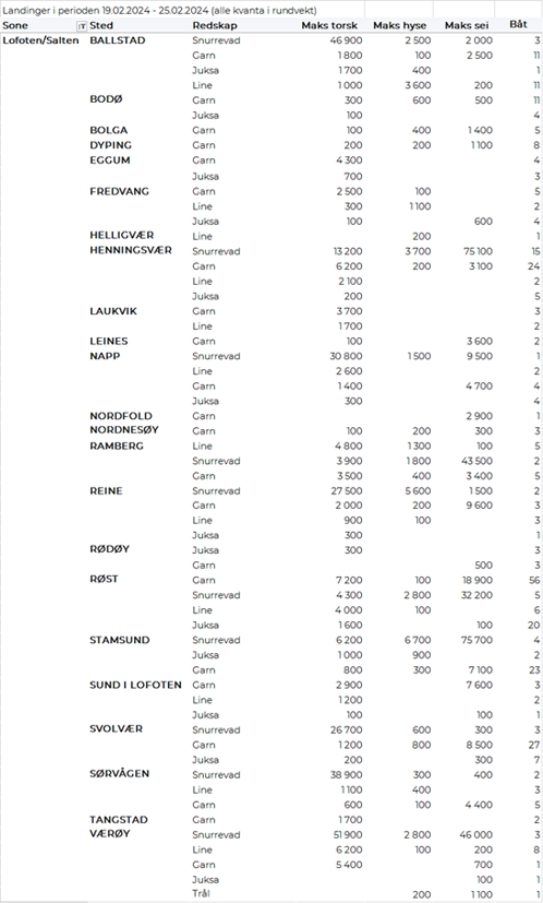 I takt med sesongen og skreiens naturlige vandringsmønster ned til norskekysten for å gyte, flytter fisket etter torsk seg stadig lenger vest- og sørover mot Lofoten. Kystfiskebåter leverte i uke åtte torsk for 401 millioner kroner av et kvantum på vel 11.000 tonn, som er ny bestenotering i år. Selv om skreifisket er hovedfokus for mange kystfiskere, fisker og leverer de også gode mengder sei, hyse, kongekrabbe og vassild.