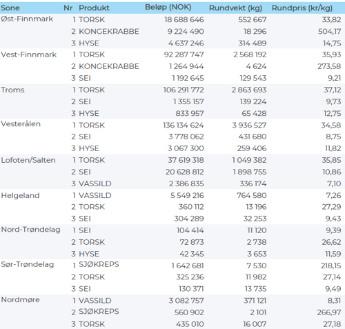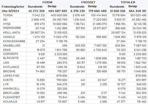 Omsetningen av ferskt råstoff i uke 8 utgjorde 485 millioner kroner, opp fra 423 millioner kroner i uke 7. Torsk, sei, vassild, kongekrabbe og hyse var størst i verdi med henholdsvis 401, 28, og 11 millioner kroner på hver av de 3 sistnevnte, og for øvrig slik det framgår av tabell 1.