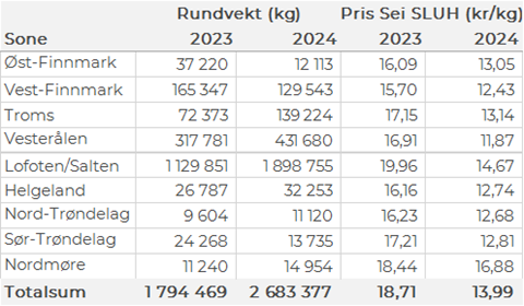 Tabell 4: Omsetning av fersk sei, A og ekstra kvalitet fra norske båter i uke 8, 2024 sammenlignet med samme uke i fjor. Fra redskapene garn, jukse, line og snurrevad, eksklusiv restråstoff.