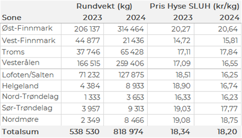 Kvantumet fersklevert hyse i uke 8 var 819 tonn til verdi 10,7 millioner kroner. En økning fra 780 tonn/ 10,5 millioner kroner uken før. Størst kvantum levert i Øst-Finnmark med 315 tonn av totalen, hvorav det aller mest er tatt på line/autoline med 304 tonn av totalen. Det gjenspeiler seg også på prisbildet med priser på pver 20 kr/kg i leveringssonen (se tabell 5). Neste sone ut er Vesterålen med 259 tonn, hvorav 196 tonn kom fra snurrevad og 53 tonn fra line/autoline. Etter Vesterålen følger Lofoten/Salten med 128 tonn, hvorav 72 tonn kom fra snurrevad. I Troms er det levert 65 tonn og i Vest-Finnmark 21 tonn, snurrevad står for det meste av denne fangsten. Kvanta under 10 tonn i resterende leveringssoner.