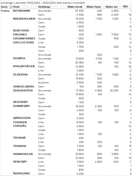 Omsetningen av fersk torsk utgjorde 11.040 tonn til verdi 401 millioner kroner, som var opp fra 9.920 tonn og 365 millioner kroner i uke 7. 36.500 tonn fersk torsk omsatt hittil i år til verdi 1.347 millioner kroner, mot 34.590 tonn og 1.098 millioner kroner pr samme dato i fjor. Av kvantumet i uke 8 var 6.840 tonn tatt på snurrevad, 3.410 tonn på garn, line/autoline stod for 570 tonn og juksa for 220 tonn. 3.110 tonn av snurrevadtorsken var levert i Vesterålen, 1.600 tonn i Vest-Finnmark, 1.420 tonn i Troms, 420 tonn i Lofoten og 290 tonn i Øst-Finnmark. 1.310 tonn av garntorsken var levert i Troms, 880 tonn i Vest-Finnmark, 650 tonn i Vesterålen, 460 tonn i Lofoten, 70 tonn i Øst-Finnmark og 35 tonn i området Helgeland-Nordmøre. Av linekvantumet var 180 tonn levert i Øst-Finnmark, 150 tonn i Lofoten, 110 tonn i Vesterålen og 80 tonn i Troms. Juksatorsken var godt spredt.