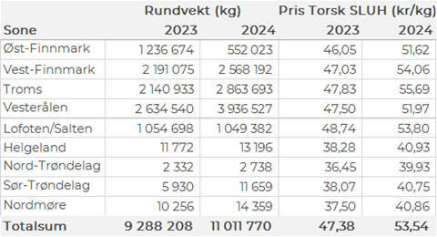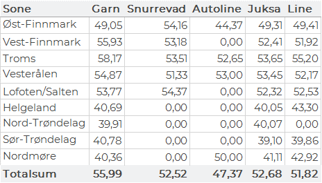 Tabell 2 og 3 viser fordelingen av landingene av fersk torsk pr leveringssone og redskap (unntatt trål), med tilhørende snittpriser. De to tabellene er basert på omsetning av kvalitet A og ekstra, der alle leveringstilstander inngår, men der snittprisene er omregnet til sløyd uten hode-priser, eksklusiv restråstoff.