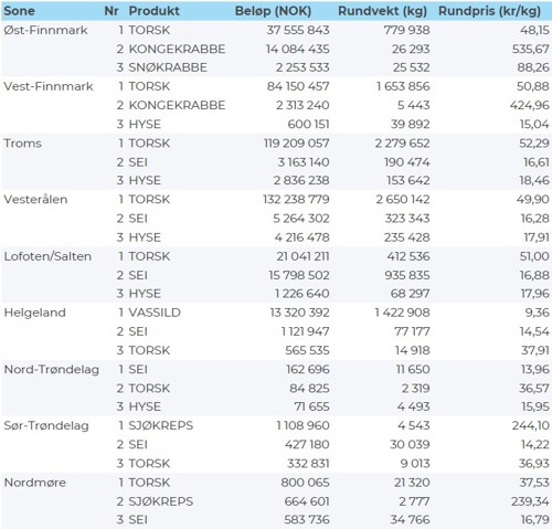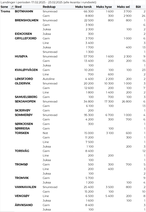 Omsetningen har økt fra forrige uke, hovedsakelig drevet av ferskfiskomsetningen hvorav torsk er størst bidragsyter. Økende omsetning for torsk og sei, mens hyse og kongekrabbe viser en liten nedgang. For torsken er det snurrevadbåtene som bidrar mest til utviklingen og tallene viser en betydelig økning i leveransene av fersk torsk til mottak i Troms og Vesterålen. For sjøfrosset råstoff er det nedgang, der omsetningsverdien hovedsakelig består av torsk og reke.
