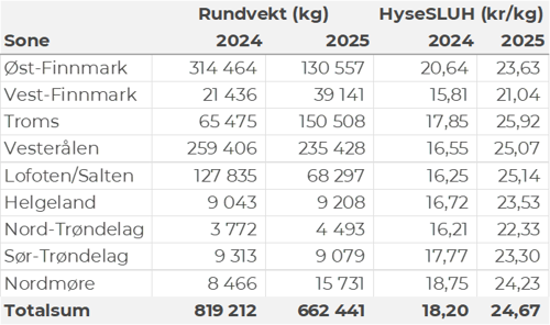 Kvantumet fersklevert hyse i uke 8 var 667 tonn til verdi 12 millioner kroner. En liten nedgang fra 670 tonn/ 12 millioner kroner uken før. Tabell 5 viser sonevis fordeling av kvanta, størst aktivitet i Troms og Vesterålen. Det meste tas på snurrevad med 349 tonn av totalen, etterfulgt av 225 tonn fra line/autoline og 84 tonn fra garn.