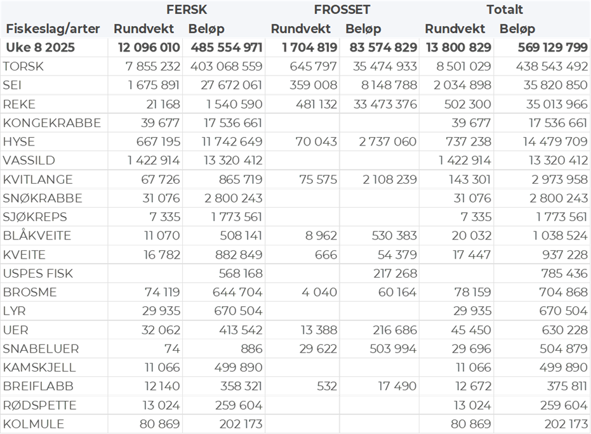 Omsetningen av ferskt råstoff i uke 8 utgjorde 486 millioner kroner, opp fra 341 millioner kroner uka før. Torsken var størst i verdi, fulgt av sei, kongekrabbe, vassild og hyse til verdi henholdsvis 403, 28, 18, 13 og 12 millioner kroner, og for øvrig slik det framgår av tabell 1.