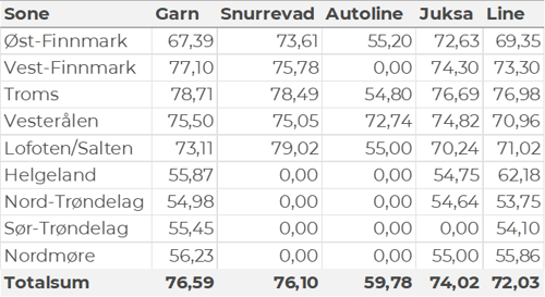 Tabell 2 og 3 viser fordelingen av landingene av fersk torsk per leveringssone og redskap (unntatt trål), med tilhørende snittpriser. De to tabellene er basert på omsetning av kvalitet A og ekstra, der alle leveringstilstander inngår, men der snittprisene er omregnet til sløyd uten hode-priser, eksklusiv restråstoff.