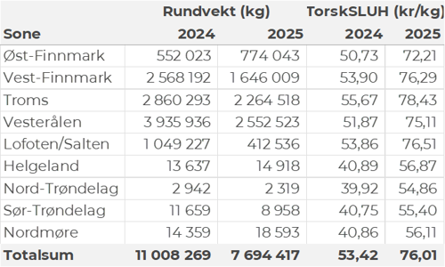 Råfisklagets omsetning hittil i år, per 24. februar 2025, har passert 3,18 milliard kroner, nærmere bestemt 3.182 millioner kroner. Det er fordelt med 2.838 millioner kroner for norske båter, og 344 millioner kroner for utenlandske. Tilsvarende for fjoråret var 3.313 millioner kroner totalt, hvorav 3.074 var etter landinger fra norske båter og 240 for utenlandske båter.