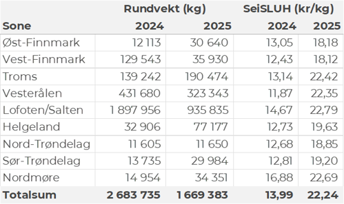 Omsetningen av fersk sei i uke 8 utgjorde 1.676 tonn til verdi 28 millioner kroner. En liten økning fra 1.650 tonn til verdi 26 millioner kroner. Kvanta fersk sei fordelt per leveringssone fremgår av tabell 4, størst aktivitet i Lofoten med 936 tonn av totalen. For seifisket er det garn som gjelder, 1.024 tonn av totalen er tatt på dette redskapet, snurrevad følger deretter med 618 tonn.