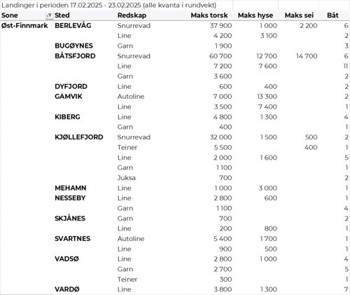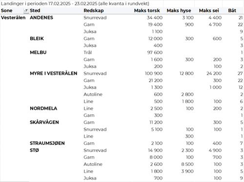 Kvanta fordelt per leveringssone fremgår av tabell 2. Tallene viser størst aktivitet i Vesterålen, etterfulgt av Troms, Vest-Finnmark og Lofoten. Innledningsvis i sesongen har det vært størst kvantum levert i Vest-Finnmark, leveringssonen har fortsatt økende kvanta levert, men torsken har nå i økende grad kommet til utenfor Troms og Vesterålen. Kvanta i sistnevnte soner går dermed betydelig opp som gjør at Vest-Finnmark utgjør en mindre andel av totalen. Det leveres også noe levende torsk som enda ikke er omsatt. I løpet av uke 8 ble det satt 181 tonn i mære, 115 tonn til Lerøy sitt anlegg i Båtsfjord, 28 tonn til Båtsfjordbrukets anlegg og 38 tonn til Staveanlegget utenfor Myre. Så langt i år er det satt 271 tonn i mære.