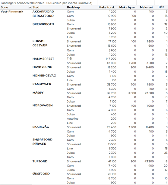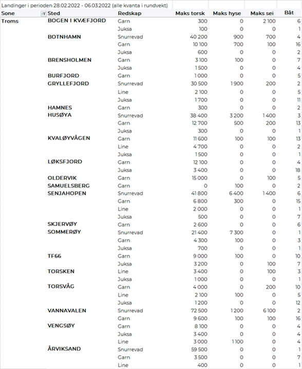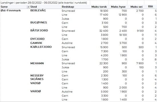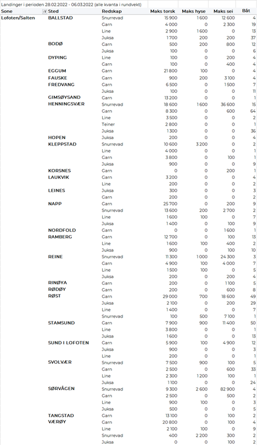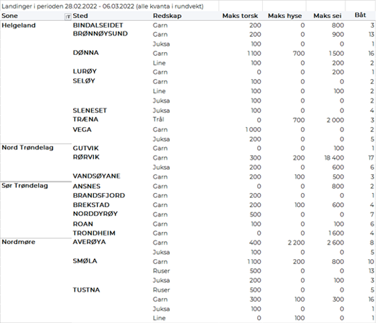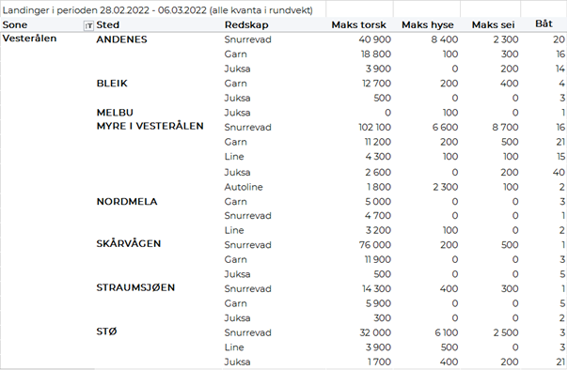 Størst snurrevadkvantum torsk var levert i Vesterålen med 2.130 tonn, deretter fulgte Vest-Finnmark med 1.000 tonn, Troms med 930 tonn, Lofoten med 330 tonn og Øst-Finnmark med 310 tonn. Garnkvantumet var fordelt med 1.580 tonn levert i Lofoten, 1.120 tonn i Troms, 630 tonn i Vest-Finnmark, 500 tonn i Vesterålen, 90 tonn i Øst-Finnmark og 35 tonn i området Helgeland-Nordmøre. Av linekvantumet på totalt 410 tonn var 150 tonn levert i Lofoten og 110 tonn i Øst-Finnmark, ellers labert. Spredt juksafiske med størst kvantum på 200 tonn levert Vest-Finnmark.