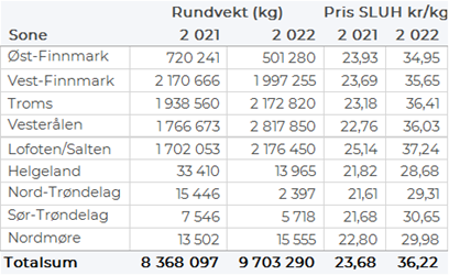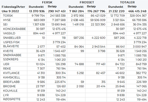 Totalomsetningen hittil i år sammenlignet med tilsvarende periode i fjor framgår av tabell 1. Den økte omsetningen for norske båter er på godt og vel 1,2 milliard kroner, fordelt med pluss på 767 på fersk- og 445 på frystomsetningen. Frystomsetningen er pr uke 9 i år på 1.354 millioner kroner, mens ferskomsetningen er oppe i 2.081 millioner kroner. En stor del av den økte frystomsetningen skriver seg fra sluttspurten i 2021 der kvantumet er omsatt på begynnelsen av 2022. Men økt omsetning av fryst råstoff også i uke 6, da ny ukerekord ble satt med 275 millioner kroner. Omsetningen av fryst torsk pr uke 9 i år er 861 millioner kroner mot 557 millioner kroner til samme tid i fjor, av kvantum på henholdsvis 30.660 og 27.640 tonn. Også fryst sei og hyse har ei fin øking både i kvantum og verdi. Når det gjelder omsetningen av fersklevert råstoff, drar torsken opp både pga. økte priser og økt kvantum. Kvantum fersk torsk omsatt så langt er 60.900 tonn, mot 53.670 tonn til samme tid i fjor, verdien er opp fra 937 til 1.508 millioner kroner. Omsatt kvantum fersk sei er opp 1.500 tonn til 14.770 tonn, og verdien er opp fra 97 til 145 millioner kroner. Kongekrabbekvantumet er opp fra 528 til 651 tonn, og som følge av økte priser er verdien økt med 140 %, fra 112 til 270 millioner kroner.