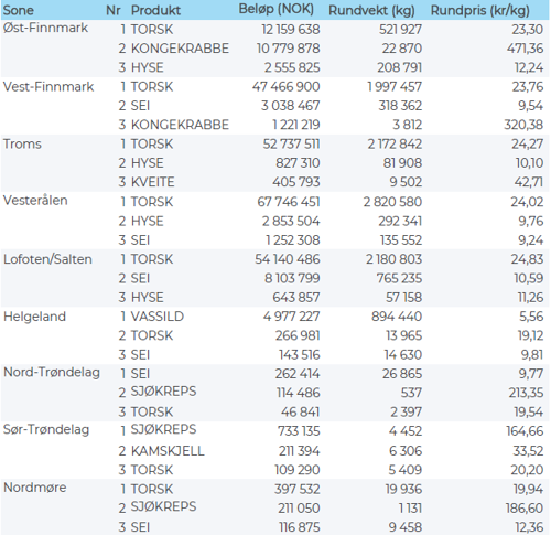 Omsetningen av fersk sei i uke 9 utgjorde 1.360 tonn til verdi 13,7 millioner kroner, en nedgang fra 1.650 tonn/16,5 millioner kroner uken før. Reduksjonen kom i Lofoten, som likevel var størst med 770 tonn omsatt, likt fordelt på garn og snurrevad med 380 tonn på hver. Videre var 320 tonn levert i Vest-Finnmark og 140 tonn i Vesterålen, nesten utelukkende fisket på snurrevad. Kvanta under 40 tonn i resterende soner.