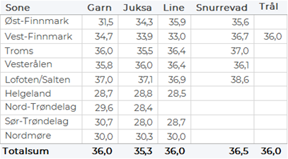 Omsetningen av ferskt råstoff i uke 9 utgjorde 290 millioner kroner, ned fra 314 millioner kroner uka før. Av det utgjorde 9.800 tonn fersk torsk 242 millioner kroner, jf tabell 2. Det er tredje uka på rad med ukekvantum i størrelsesorden 9.800-11.300 tonn. Snurrevad reduserte sine landinger fra 5.340 tonn i uke 8 til 4.700 tonn i uke 9, og det var reduksjon også for lina og trål. Garnleveransene økte fra 3.300 til 3.950 tonn, og juksa fra 560 til 580 tonn. Tabell 3 viser andelen av dette kvantumet registrert med kvalitet A og Ekstra på sluttseddel, tatt på redskapene garn, juksa, line, snurrevad og trål, og tilhørende snittpriser pr leveringssone, sammenlignet med samme uke i fjor. Tabell 4 viser tilsvarende snittpriser oppnådd i uke 9 fordelt på de nevnte redskapene. Vesterålen var størst i kvantum med 2.820 tonn og økte med det fra 2.440 tonn uka før. Lofoten hadde også økte torskelandinger, fra 1.690 tonn uka før til 2.190 tonn i uke 9. Troms holdt seg jevnt på 2.200 tonn, så reduksjonen kom i Finnmark der Vest-Finnmark gikk ned fra 2.800 til 2.020 tonn og Øst-Finnmark fra 1.100 til 520 tonn. Labert med leveranser i området Helgeland-Nordmøre med 40 tonn pr uke.