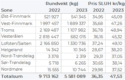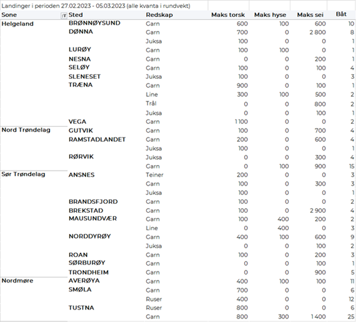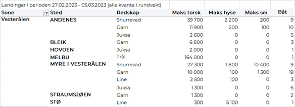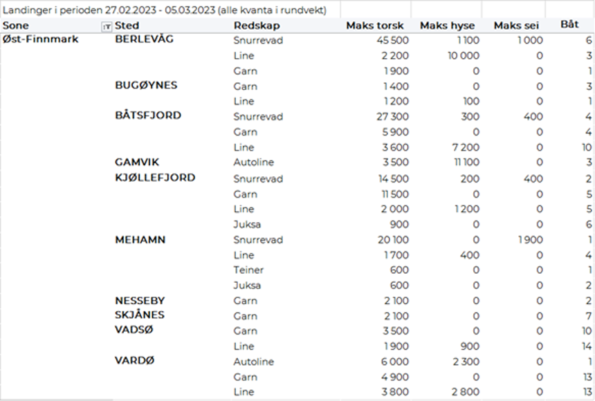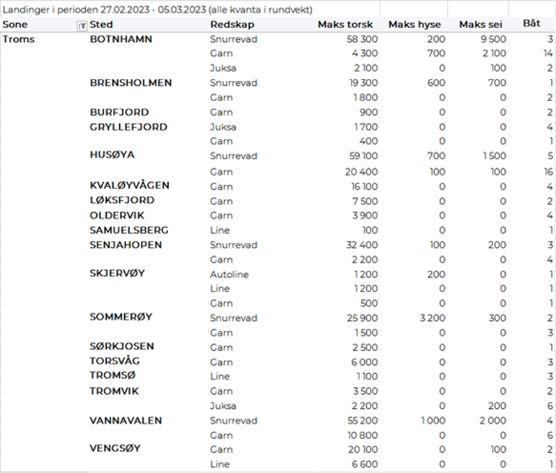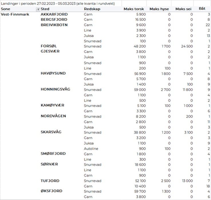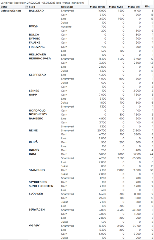 Omsetningen av fersk torsk i uke 9 utgjorde 5.590 tonn til en verdi av 180 millioner kroner, ned fra 9.640 tonn og 309 millioner kroner uka før. Fordelt per redskap viser tallene 3.140 tonn fra snurrevad, 1.870 tonn fra garn, 275 tonn fra line/autoline, 140 tonn fra juksa, og 160 tonn var tråltorsk. Største leveringssone er Vest-Finnmark med 1.890 tonn. Deretter følger Lofoten med 1.330 tonn og Troms med 1.100 tonn. Deretter følger Vesterålen med 680 tonn og Øst-Finnmark med 540 tonn. Kvanta under 15 tonn i resterende soner. Det var størst reduksjon i Vesterålen, som hadde 2.800 tonn levert i uke 8. Det var bare Lofoten som hadde økt kvantum sammenlignet med uka før, opp fra 1.060 tonn.