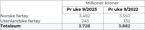 Tabell 2: Omsetning for norske båter i uke 9/2023, fordelt pr fersk/fryst og pr fiskeslag.