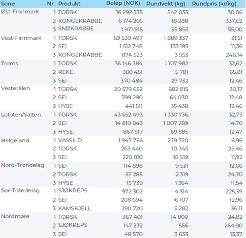 Foreløpige tall for omsetningen av fryst råstoff i perioden viser 147 millioner kroner, som er på samme nivå som uka før. Vel 2.000 tonn torsk var størst i verdi med 72 millioner kroner. I tillegg var 1.870 tonn fryst sei omsatt til verdi 33 millioner kroner, fulgt av 260 tonn snøkrabbe til verdi 17 millioner kroner og 860 tonn hyse/16 millioner kroner. Det var trål som stod for det meste av omsetninga, med i hovedsak 1.940 tonn torsk og 1.820 tonn sei.