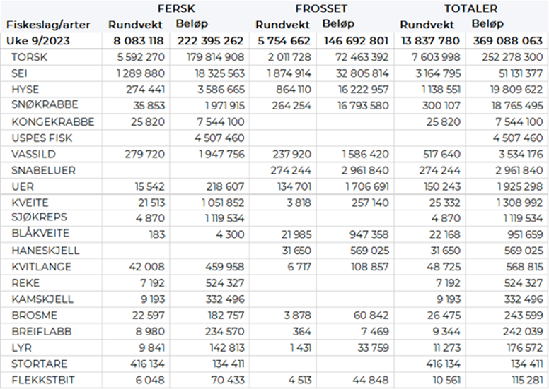 Omsetningen av ferskt råstoff i uke 9 ble 222 millioner kroner, som var ned fra 368 millioner kroner i uke 8. Torsk, sei og kongekrabbe var størst i verdi med henholdsvis 220, 18 og 7,5 millioner kroner, og for øvrig slik det framgår av tabell 2.