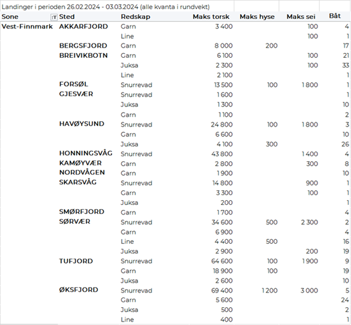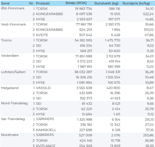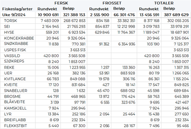 Omsetningen av ferskt råstoff i uke 9 utgjorde 321 millioner kroner, ned fra 486 millioner kroner i uke 8. Torsk, sei, kongekrabbe og hyse var størst i verdi med henholdsvis 269, 22, 9 og 7 millioner kroner, og for øvrig slik det framgår av tabell 1.