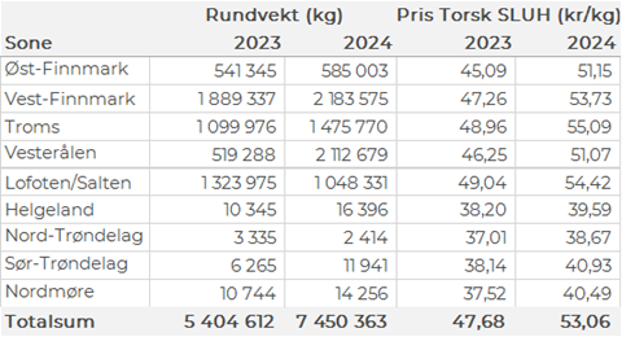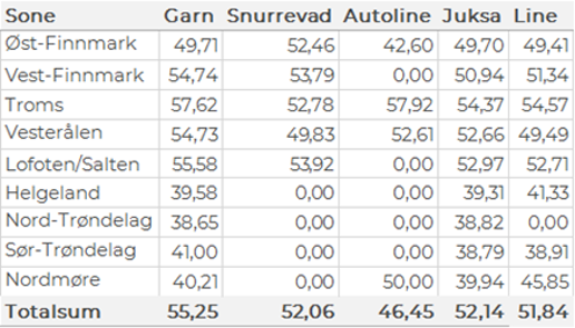 Tabell 2 og 3 viser fordelingen av landingene av fersk torsk pr leveringssone og redskap (unntatt trål), med tilhørende snittpriser. De to tabellene er basert på omsetning av kvalitet A og ekstra, der alle leveringstilstander inngår, men der snittprisene er omregnet til sløyd uten hode-priser, eksklusiv restråstoff.