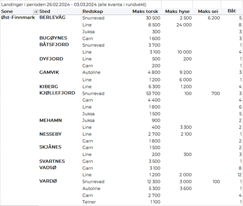 Når det gjelder landinger av fryst råstoff i uke 9 som bare delvis er omsatt, har vi følgende tall: Landingene utgjorde totalt 9.570 tonn, opp fra 7.610 tonn uka før. 2.280 tonn sei var størst i kvantum, fulgt av 2.140 tonn snabeluer, 1.970 tonn torsk, 1.670 tonn hyse og 1.360 tonn snøkrabbe. Det var leveranser fra 9 trålere med totalt 8.000 tonn, herav nevnte kvantum snabeluer, og det meste av nevnte kvanta fisk. 1 snurrevadbåt leverte 210 tonn, herav 160 tonn sei og 30 tonn torsk. Snøkrabbekvantumet var levert av 8 båter.