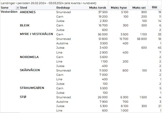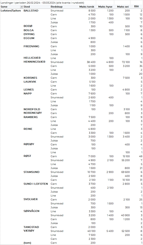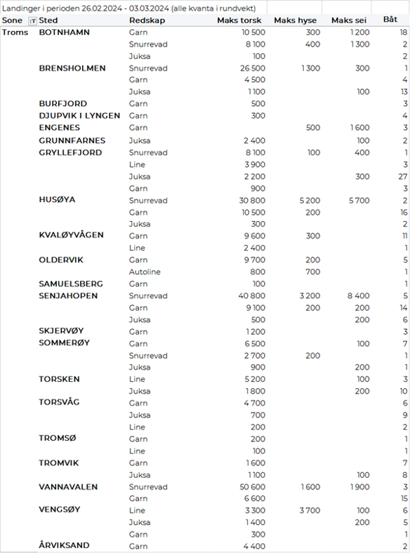 Omsetningen av fersk torsk utgjorde 7.480 tonn til verdi 269 millioner kroner, som var ned fra 11.040 tonn og 401 millioner kroner i uke 8. 43.960 tonn fersk torsk omsatt hittil i år til verdi 1.615 millioner kroner, mot 38.410 tonn og 1.220 millioner kroner pr samme dato i fjor. Av kvantumet i uke 9 var 4.090 tonn tatt på snurrevad, 2.450 tonn på garn, juksa stod for 580 tonn og line/autoline for 370 tonn. 1.490 tonn av snurrevadtorsken var levert i Vesterålen, 1.140 tonn i Vest-Finnmark, 680 tonn i Troms, 390 tonn i Øst-Finnmark og 380 tonn i Lofoten. 770 tonn av garntorsken var levert i Vest-Finnmark, 650 tonn i Troms, 460 tonn i Lofoten, 440 tonn i Vesterålen, 90 tonn i Øst-Finnmark og 40 tonn i området Helgeland-Nordmøre. Av linekvantumet var 150 tonn levert i Lofoten, 100 tonn i Øst-Finnmark, 50 tonn i Vest-Finnmark og ellers spredt. Juksa som var eneste redskap med økte leveranser fra uka 8, hadde størst aktivitet i Vest-Finnmark der 250 tonn ble levert, fulgt av Vesterålen med 160 tonn, Troms med 100 tonn og Lofoten med 60 tonn.