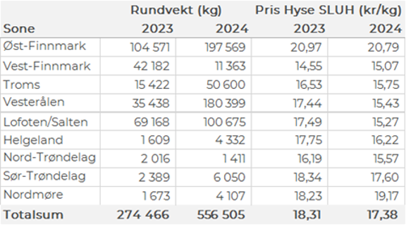 Kvantumet fersklevert hyse i uke 9 var 559 tonn til verdi 6,9 millioner kroner. En nedgang fra 819 tonn/ 10,7 millioner kroner uken før. Størst kvantum levert i Øst-Finnmark med 197 tonn av totalen, hvorav det aller mest er tatt på line/autoline med 187 tonn av totalen. Det gjenspeiler seg også på prisbildet med priser på over 20 kr/kg i leveringssonen (se tabell 5). Neste sone ut er Vesterålen med 182 tonn, hvorav 163 tonn kom fra snurrevad. Etter Vesterålen følger Lofoten/Salten med 101 tonn, hvorav 75 tonn kom fra snurrevad. I Troms er det levert 51 tonn og i Vest-Finnmark 11 tonn, snurrevad står for det meste av denne fangsten. Kvanta under 5 tonn i resterende leveringssoner.