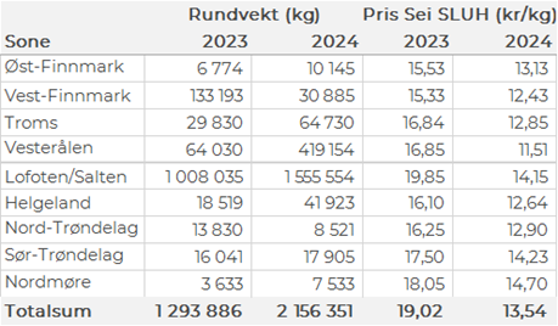 Omsetningen av fersk sei i uke 9 utgjorde 2.165 tonn til en verdi av 21,8 millioner kroner. En nedgang fra 2.690 tonn/ 28 millioner kroner. Kvantumet i uke 9 var fordelt med 1.511 tonn tatt på snurrevad og 620 tonn på garn, 27 tonn på juksa. Det meste av snurrevadkvantumet, 1.020 tonn, var levert i Lofoten, og for øvrig 412 tonn i Vesterålen, 43 tonn i Troms og 27 tonn Vest- Finnmark. Også når det gjelder garnkvantumet var det meste, 525 tonn, levert i Lofoten/Salten. Den totale geografiske fordelingen framgår av tabell 4. Fremdeles var det mer sei en torsk/skrei levert i Lofoten/Salten.