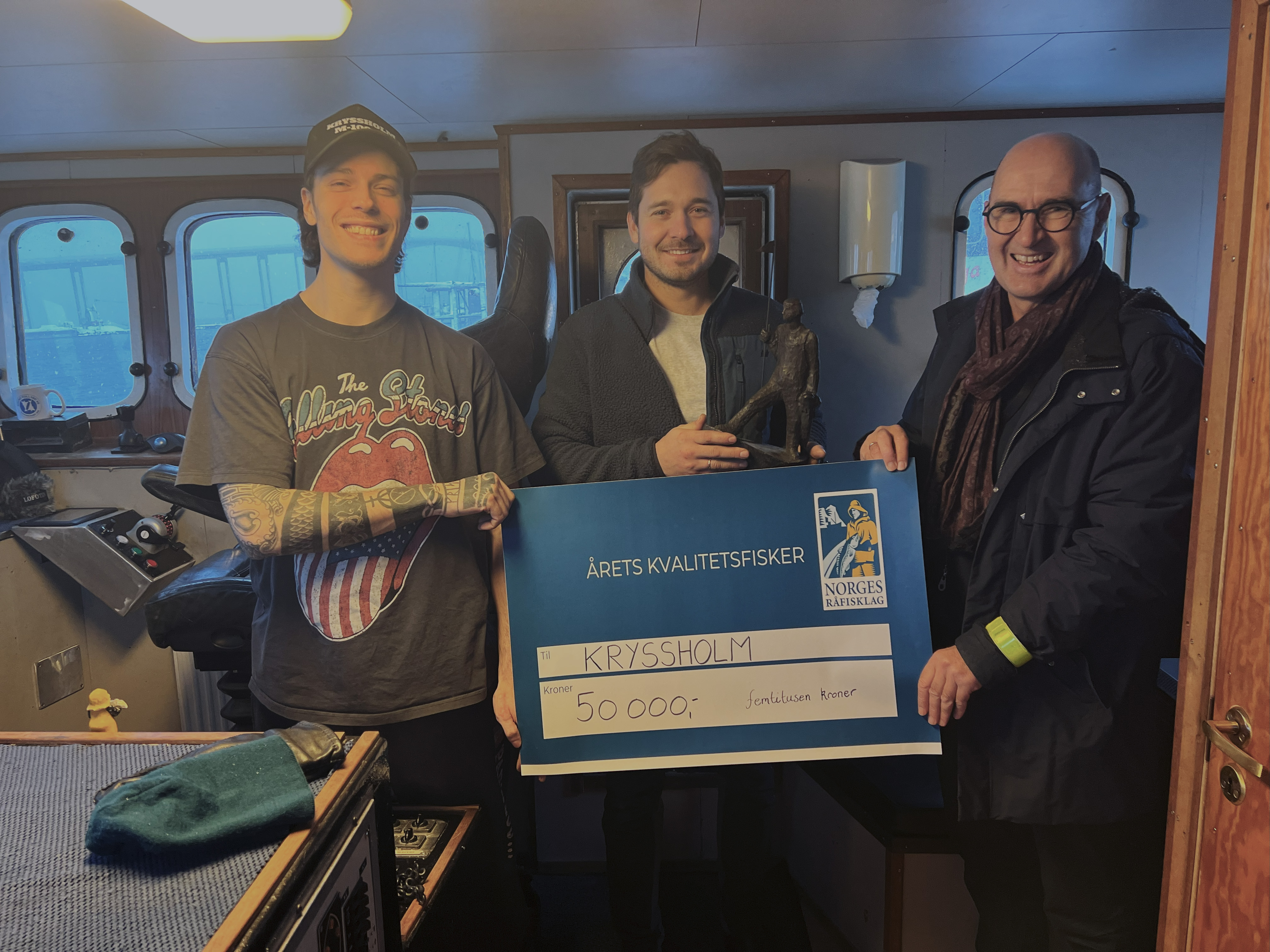 “Kryssholm” har nylig avsluttet autolinefisket utenfor Finnmarkskysten og var en kort tur innom Lofoten for å legge om til garnfiske. På vei nordover til Kvænangen var de innom Tromsø, og det var her Norges Råfisklag overrasket dem med prisen. Det var med stolthet i blikket Johannes Ormset kunne kalle opp sin kompanjong og medeier Christoffer Folland, og informere om utmerkelsen. Det var tydelig at dette satte de stor pris på. Duoen samarbeider om planlegging og drift av båten, og har delt driftsåret i to halvdeler. På vinter og vår fiskes det hjemme på Mørekysten, andre halvår tilbringes i Nord-Norge.