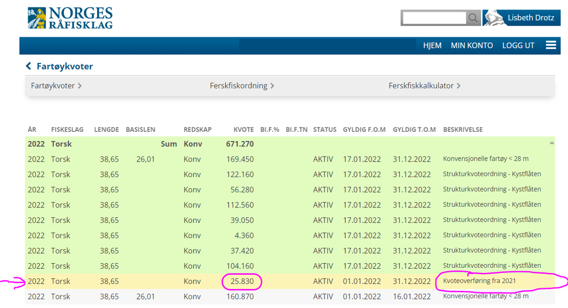 6. Se etter linjen "Kvoteoverføring fra 2021" under feltet "BESKRIVELSE" og sjekk at den overførte mengden stemmer under feltet "KVOTE"