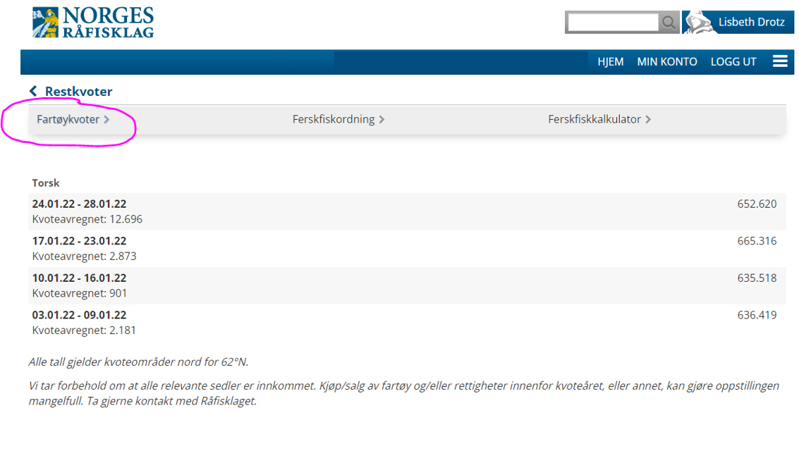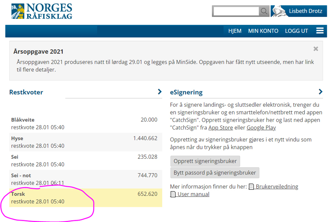 Råfisklaget er opptatt av at det ikke fiskes mer enn hva naturen tåler, og oppfordrer deg som er fisker å sjekke at du har fått korrekt mengde torsk overført fra 2021 til 2022. Se hvordan lengre ned.