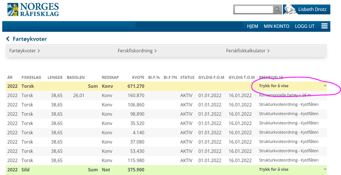5. Klikk på "Trykk for å vise" på linjen "2022 Torsk"