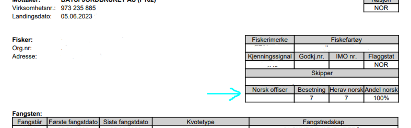 Krav knyttet til besetning/skipper/offiserer gjelder ikke fangst innenfor 12 nautiske mil. Disse fangstene er definert som norsk når de landes av norske fiskefartøy uavhengig av fartøyets besetning.