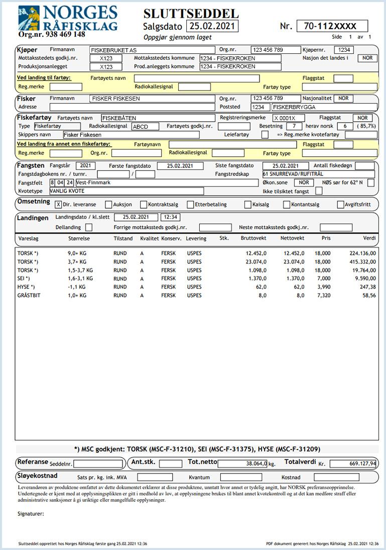 Når en fisker leverer fangst på et fiskebruk skrives en svært omfattende kvittering som kalles for en sluttseddel. Denne sluttseddelen inneholder detaljert informasjon om fisker, fiskebåt, fangstfelt, fiskekjøper, fiskeslag, størrelse, kvalitet, tilstand og priser fordelt på hver av disse. Den norske sluttseddelen er unik i verdenssammenheng siden den både inneholder detaljert informasjon om både mengde og pris. Sluttseddelen er dermed et viktig dokument for å dokumentere hvor mye som er tatt opp av havet og hvor mange penger som er i omløp.