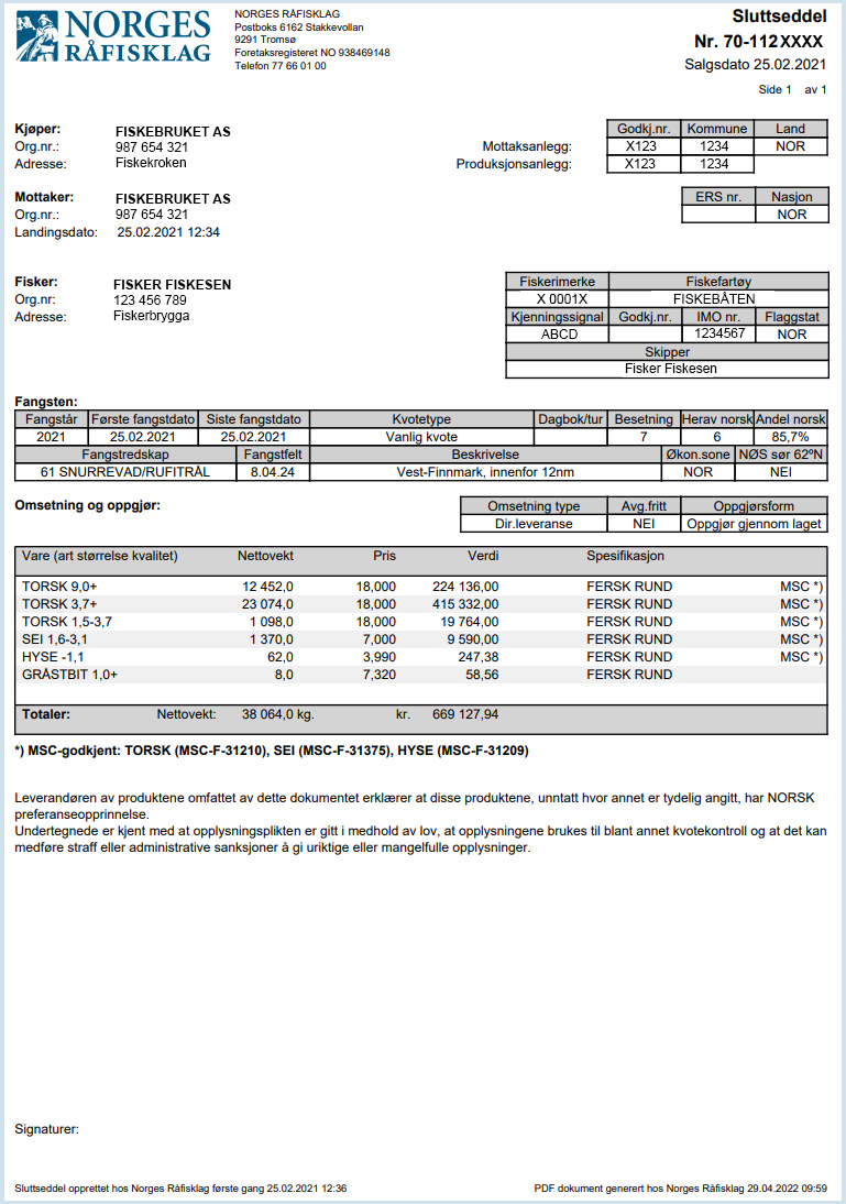 Råfisklagets sluttseddel er blant annet grunnlaget for betaling til fisker for levert fangst og kontroll av den mengden fisk hvert enkelt fartøy har lov å fiske. Den er også grunnlaget for fangstsertifikat og offisiell norsk villfiskstatistikk. For fiskeren fungerer den som en kvittering som garanterer at fiskeren får penger for fangsten de leverer. En seddel i verdensklasse med andre ord!