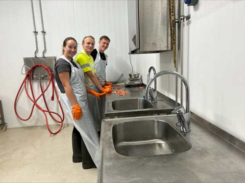 Marie, Eirik og kontrollør Truls utfører kontroll av frosne industrireker. Her fikk de opplæring i ulike metoder som blir brukt for å danne grunnlaget for fastsettelse av salgspris.