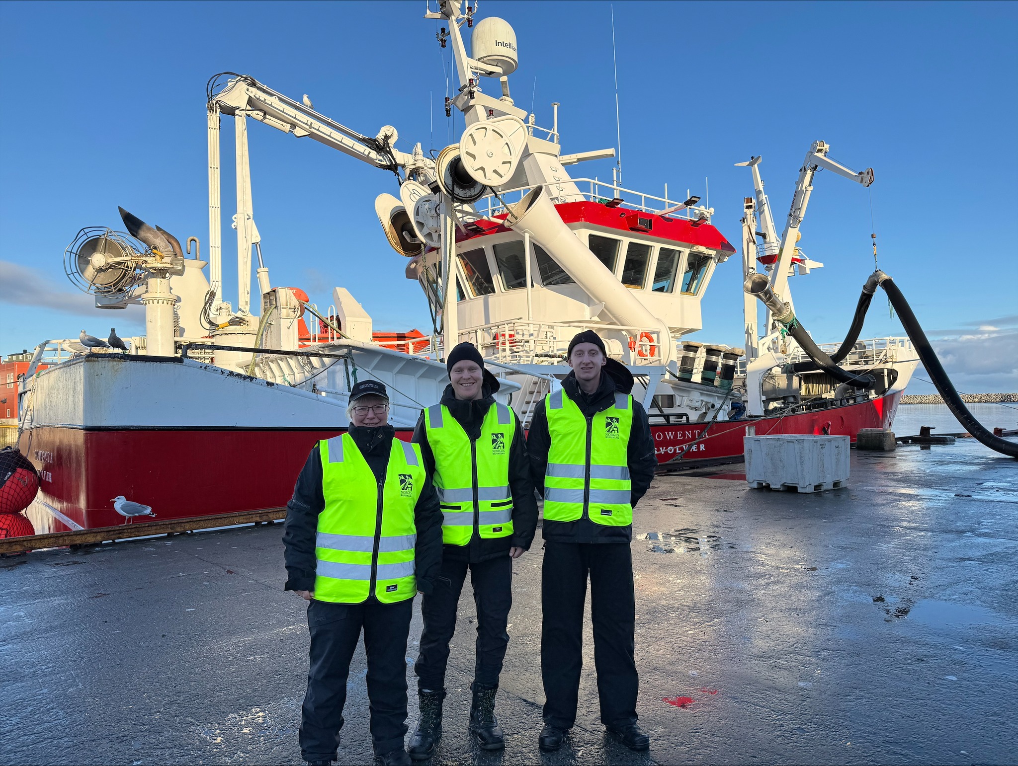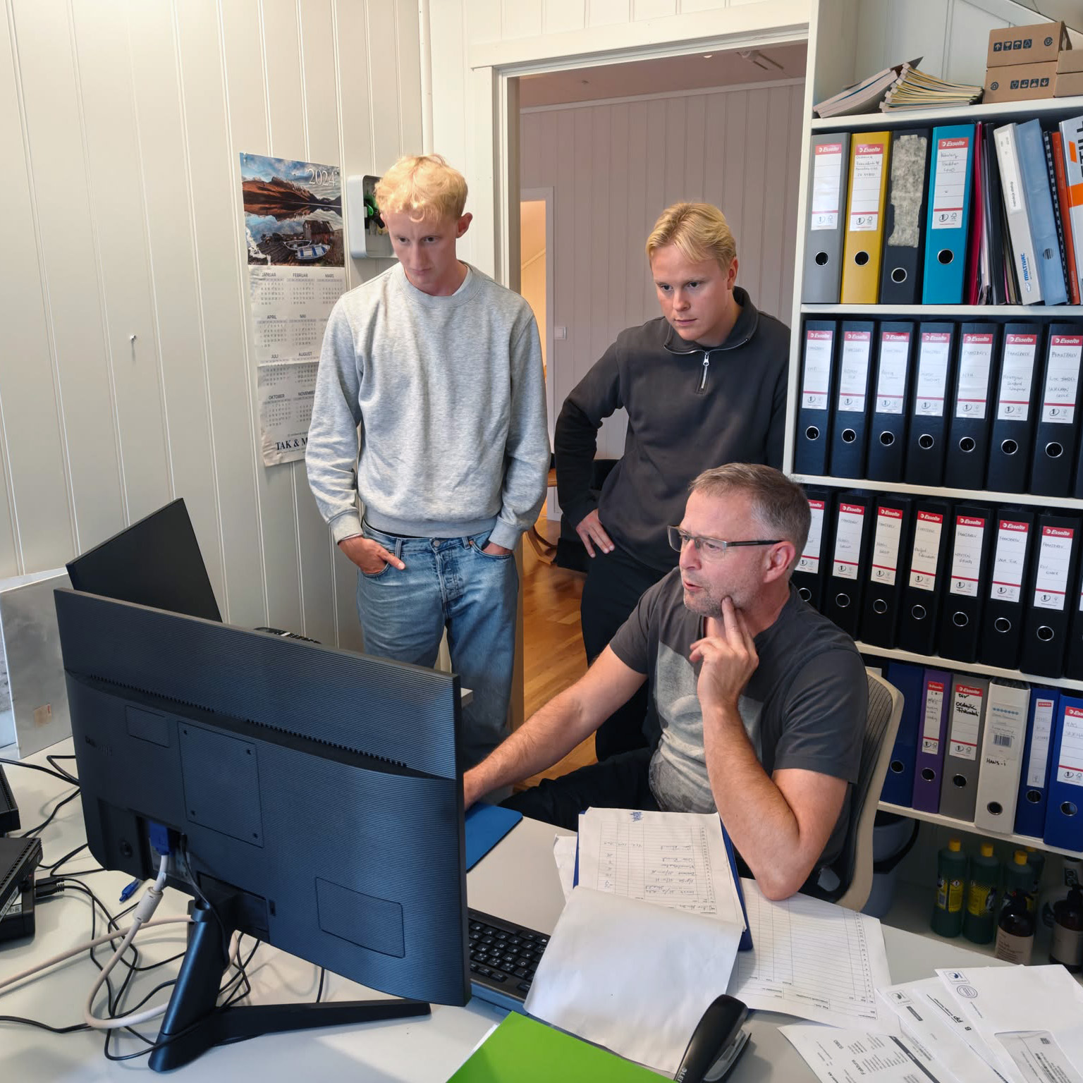 Gøran With Dybdal (23 år) og Bernhard Troy Gjendem (21 år) er i praksis denne høsten hos Norges Råfisklag. Her er de sammen med Råfisklagets kontrollør Lillian Hansen.