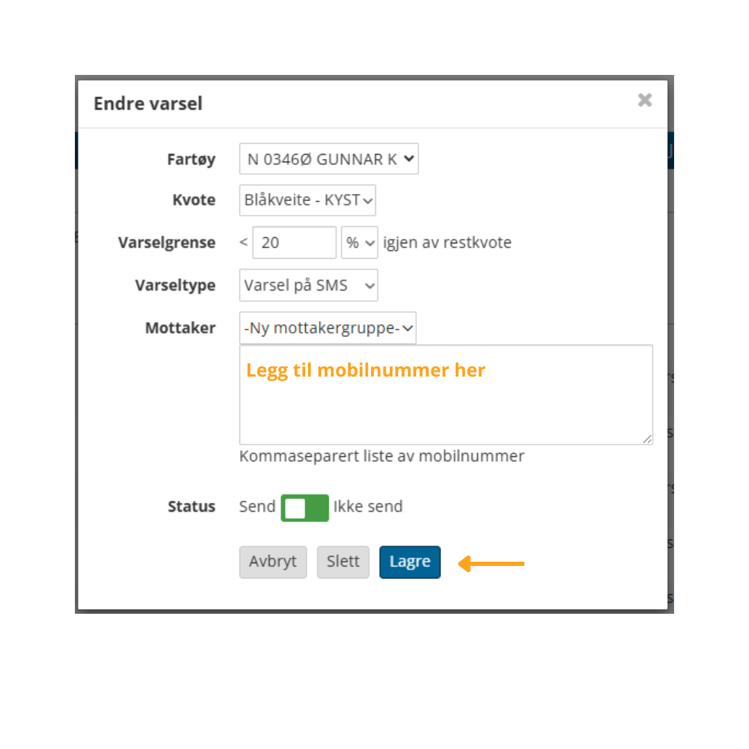 Legg til mottakers mobiltelefonnummer. Ønsker du å legge til flere nummer, må du skille de med komma tegn. Velg lagre.