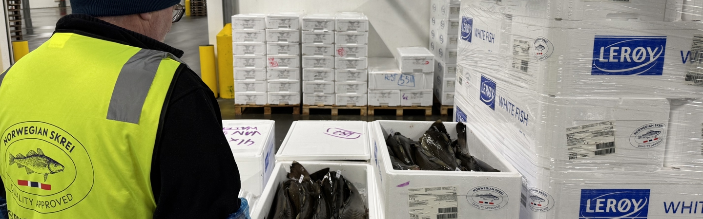 Skreipatruljens Ronje Berg sjekker kvaliteten på en tilfeldig utvalgt eske med kvalitetsmerket Skrei på en omlastingsterminal i Europa. Temperaturkontroll er en av de viktige sjekkpunktene som utføres. For at skreien skal ha lang holdbarhet, er det viktig at den er kjølt ned mot null grader før den pakkes i esker, slik at isen smelter sakte under transport og holder fisken kjølig hele veien frem til sluttkunde. Denne skreien var perfekt.