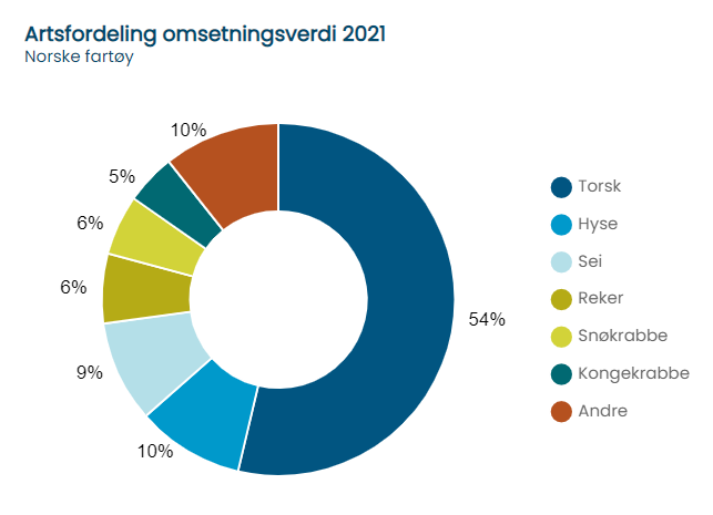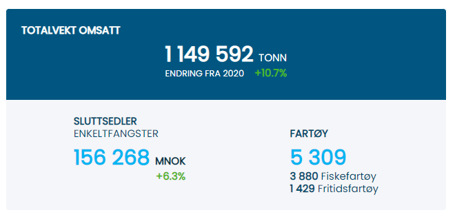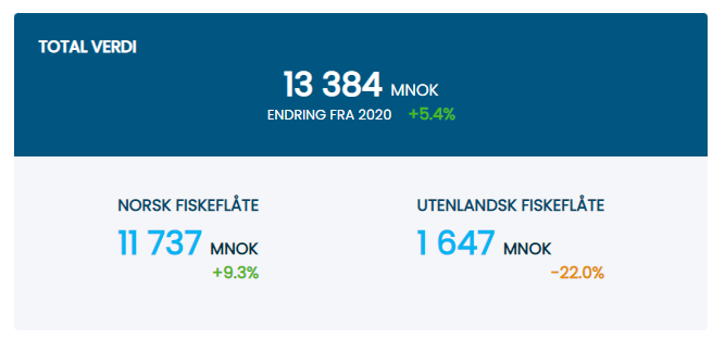 Norske fiskere sto for i overkant 11,7 milliarder av denne omsetningen. Dette er en økning på 1 milliard fra 2020 og ny toppnotering for norske fiskere i Råfisklaget selv om det korrigeres for inflasjon – ca. 0,4 og 0,2 milliarder opp fra henholdsvis 2020 og 2019.